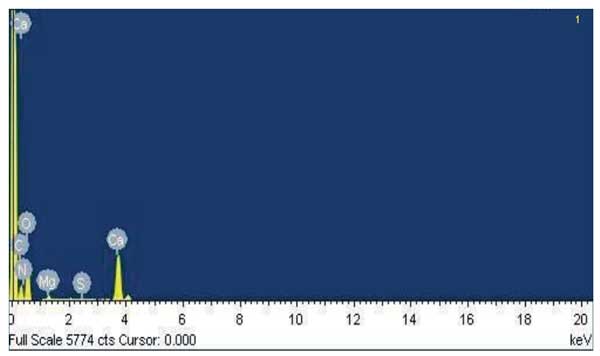 活性炭的表面化學(xué)成分是通過使用能量色散X射線(EDX)光譜確定的。得到的光譜見圖2,C、N、0、Mg、Ca的百分比分別為7.64%、14.53%、35.31%、0.70%、41.80%。FTIR結(jié)果支持C、N和O的存在,該結(jié)果表明存在羰基和胺基團(tuán)。除此之外,高百分比的Ca表明主要是鈣的性質(zhì)。此外,光譜中出現(xiàn)Mg表明Mg化合物與碳和氧強(qiáng)烈結(jié)合。因此,無論是用熱蒸餾水還是冷蒸餾水,都不容易通過洗滌去除。