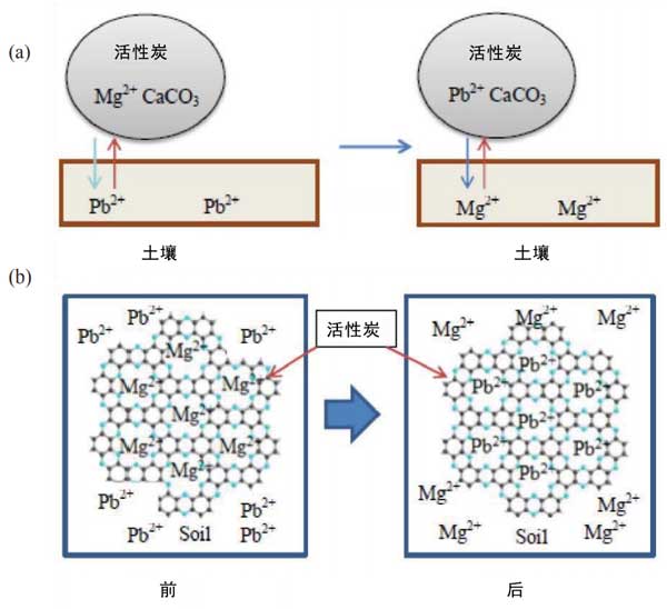 圖3:(a)活性炭中的Mg2+與土壤中Pb2+的離子交換過程和(b)鉛污染土壤中的離子交換。