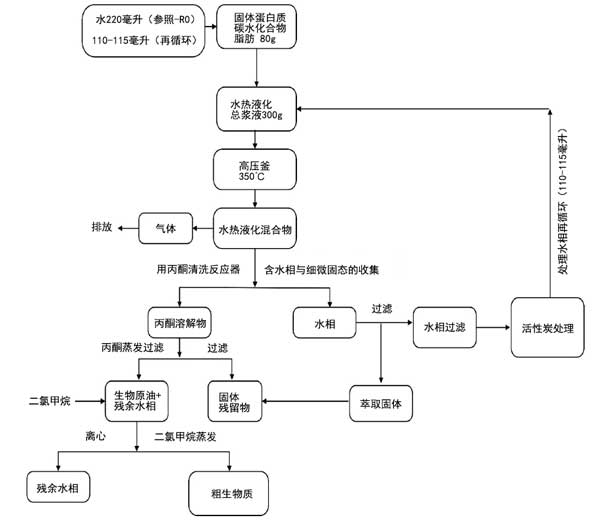 在亞臨界條件350℃下通過高壓釜產生的水相用粉末活性炭處理,加入相當于130毫升水相總重量的2%的活性炭。將制備的混合物在磁力攪拌器下在30°C以600rpm混合4小時。活性炭的時間和用量是經過多次試驗后選擇的,因為較長的混合時間和高用量不會影響脫氮程度。然后使用顆粒截留率為5-13μm的濾紙對收集的混合物進行真空過濾。最后,將110ml處理過的水相再循環回水熱液化單元。