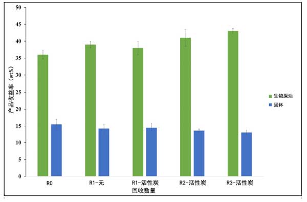 進行了五次水熱液化實驗,一次作為基線實驗,一次將水相回收而未經活性炭處理的,以及三個通過活性炭處理水相的實驗,即:R1-活性炭、R2-活性炭和R3-活性炭(圖2)。通過應用水相回收,在使用未經處理的水相進行一輪回收后,生物原油產率從36%增加到39%,而處理過的水相回收后,生物原油產率從36%增加到43.2%。生物原油產量的增加主要是由于水相中濃縮的輕極性有機物。