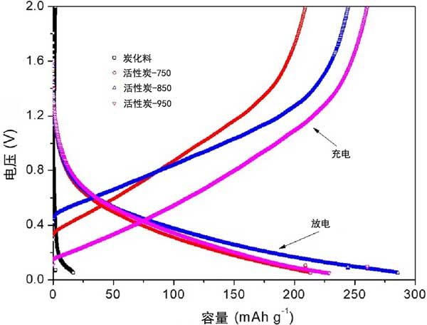 充放電曲線評估了活性炭的的電化學(xué)性能,不同溫度活化的活性炭電極如圖3所示。CD測試是在0.25C的電流密度速率下進(jìn)行的;罨瘻囟忍岣吡顺潆娙萘;钚蕴繕悠返母叱潆娙萘繛260.36mAh/g-1,而炭化料樣品的低充電容量為1.98mAh/g-1。這是因為活化的樣品可以吸收很多的鋰離子。放電曲線顯示三個不同的電位區(qū)域,這可能歸因于不同的機(jī)制。0到0.12V的區(qū)域?qū)?yīng)于鋰離子從隨機(jī)取向的小分子堆疊中的微孔中脫出。0.12到0.8V的區(qū)域歸因于鋰離子從無序石墨烯層中脫出。高于0.8V的區(qū)域?qū)?yīng)于鋰從各種邊緣位置或石墨烯層中含H-/O官能團(tuán)的脫嵌。