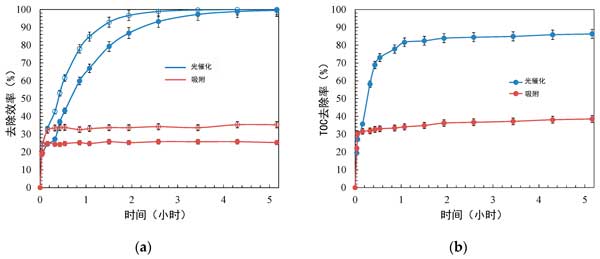 圖3:活性炭催化劑的吸附和光催化過(guò)程的去除效率。(a)初級(jí)降解,(b)礦化。