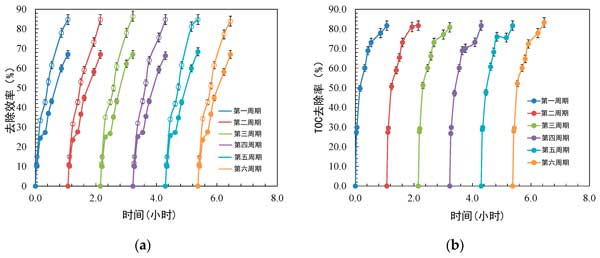 圖4:使用活性炭催化劑在六個(gè)重復(fù)循環(huán)內(nèi)對(duì)苯胺和苯并噻唑進(jìn)行光催化降解的可重復(fù)使用性測(cè)試。(a)苯胺和苯并噻唑的初級(jí)降解(b)礦化。