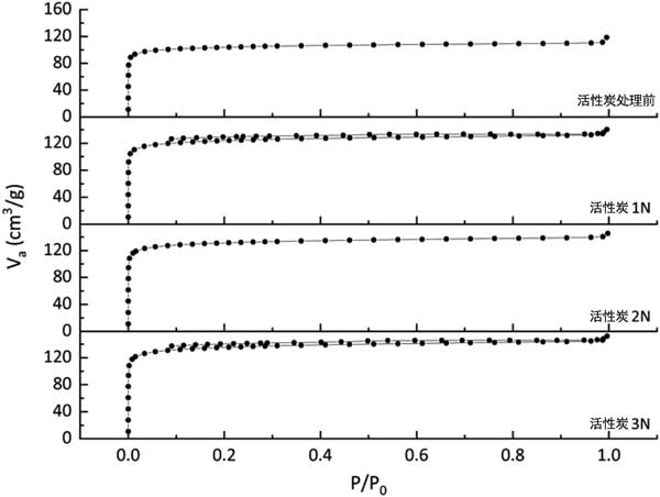 使用BET法的氮氣物理吸附分析儀確定吸附劑吸附等溫線并測量比表面積和孔體積。等溫曲線如圖1所示。圖1顯示處理前后的所有活性炭均為I型等溫線。I型等溫線表明吸附劑通常是微孔的,暴露的表面幾乎完全位于微孔內(nèi)部,幾乎沒有或沒有外表面可供進一步吸附一次充滿吸附質(zhì)。I型向P/P0軸凹,吸附量達到極限值(P/P0→1)P/P0是相對壓力,它是吸附氣體平衡壓力與其飽和平衡蒸汽壓力的比值。圖1中清楚地描述了酸處理可以增加吸附氮氣的體積,這表明增加的孔體積。