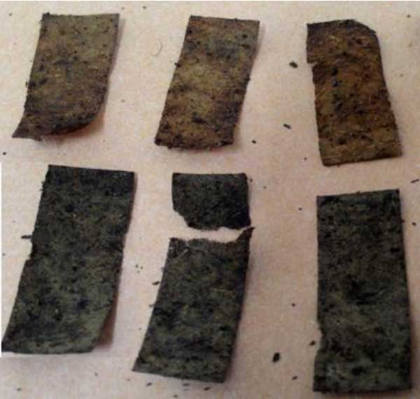 在觀察結束時,與不含納米活性炭的紙張相比,含納米活性炭的紙張降解更徹底,物理結構更脆。大約50%的活性炭紙被完全降解,同時在土壤試塊生物降解試驗中只有1個纖維素紙被完全降解。觀察12周后的紙張外觀如圖2所示。但是,紙張的降解能力也受紙張類型的影響。以往對各類紙張的生物降解性的研究結果表明,不同類型的紙張在受控條件下具有不同的生物降解性。研究發現,除非改變制造工藝,否則報紙和紙巾/紙手帕更難生物降解。