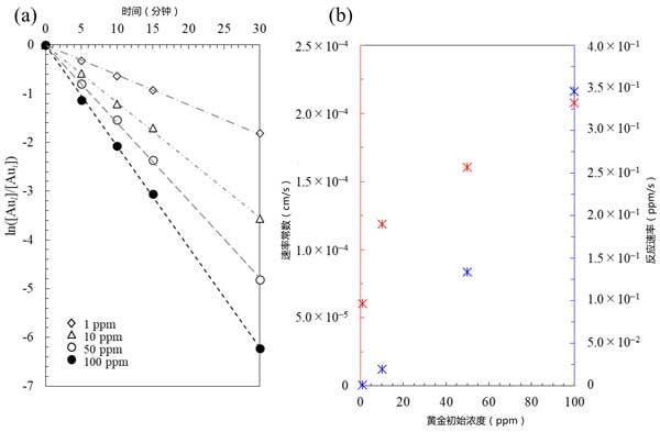 圖1:(a)初始金濃度對金離子回收率的影響,和(b)通過鋁和活性炭在銨中的電流相互作用進行的膠合反應(yīng)的速率常數(shù)/反應(yīng)速率與初始金濃度的關(guān)系圖硫代硫酸鹽體系(注意反應(yīng)速率為負值)。