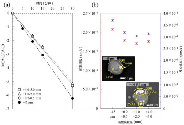 圖2:(a)活性炭尺寸對金離子回收率的影響,以及(b)鋁和活性炭在硫代硫酸銨體系中通過電偶相互作用進行的膠合反應(yīng)的速率常數(shù)/速率與活性炭尺寸的關(guān)系圖(注意,反應(yīng)速率為負值)。