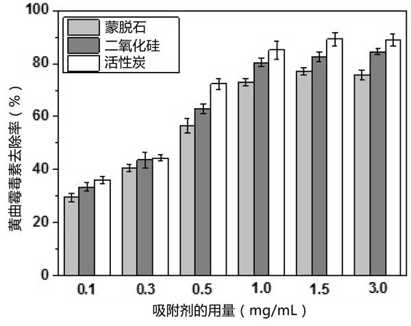 三種吸附劑對AFB1的吸附在25℃下進行24小時。圖1顯示了活性炭和其它吸附劑用量的AFB1去除率。無論吸附劑劑量如何,使用活性炭時去除率更高,其次是二氧化硅和天然蒙脫石。正如預期的那樣,AFB1的去除率隨著吸附劑劑量的增加而增加,這可以通過AFB1與吸附劑之間的相互作用增加來解釋,包括氫鍵、孔填充和靜電吸引力。吸附劑量為1.0mg/mL時,黃曲霉毒素的去除率使用蒙脫石、二氧化硅和活性炭時,分別為73.23%、80.35%和85.09%。在較高的吸附劑量(1.5mg/mL)下,去除率分別略微增加至75.56%、83.48%和89.15%。在這個吸附系統中,當吸附劑以較低濃度使用時,可用的吸附位點較少。因此,增加吸附劑濃度有效地增加了吸附位點的數量,從而提高了AFB1的去除率。但濃度過高時,吸附劑顆粒間會發生膠結、絮凝和團聚現象。這導致可用吸附位點的數量穩定或減少,并且去除率沒有進一步提高。此外,當吸收劑以高濃度使用時,可能會消除維生素E和甾醇等微量營養素,從而導致營養流失。因此,使用濃度為1.0mg/mL的吸附劑被認為是合適的,因此在進一步的實驗中被采用。
