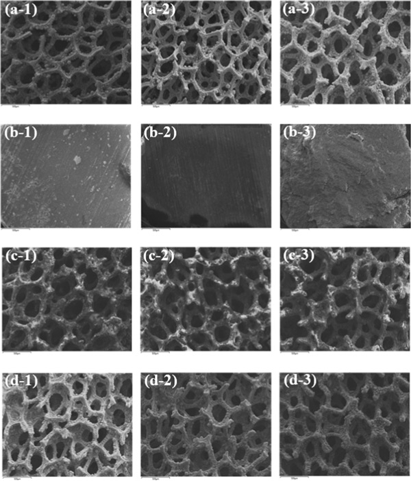 圖1:(a)金屬泡沫催化劑、(b)HZSM-5顆粒催化劑、(c)HZSM-5/金屬泡沫催化劑和(d)活性炭/金屬泡沫催化劑的SEM照片,反應前的催化劑(a-1、b-1、c-1、d-1)、450℃反應后的催化劑(a-2、b-2、c-2、d-2)、催化劑在550℃反應后(a-3,b-3,c-3,d-3)。