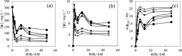 圖2:苯濃度隨水溶液(a)氣相苯濃度 (揮發) (b) 和吸附在活性炭中的苯質量 (c) 在不同活性炭的水溶液中的吸附測試期間衰減。