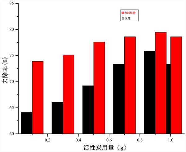 圖1:在接觸時間為100分鐘、初始BPA濃度為200mg/L、溫度為55℃時,用量對活性炭和磁力活性炭吸附BPA的影響。