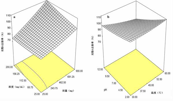 圖3:雙酚A去除效率對磁力活性炭影響的響應面3-D(a)pH和劑量以及(b)pH和溫度。
