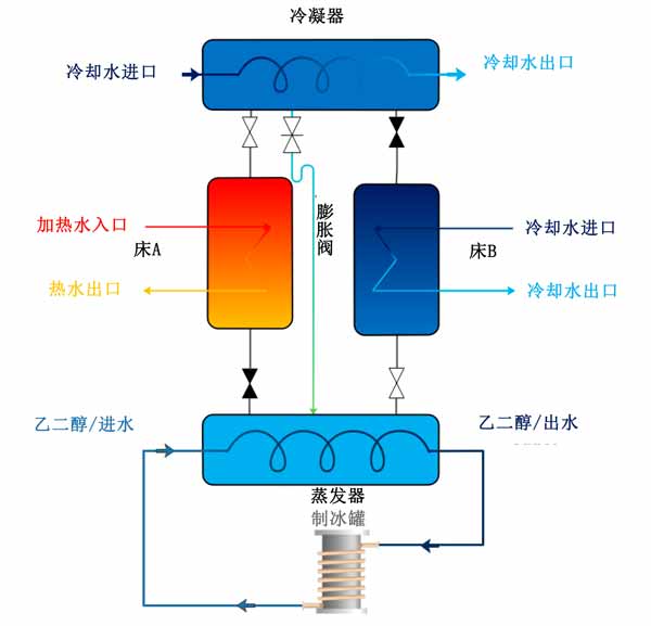 吸附制冰系統的兩床配置來檢查使用50%活性炭、10%聚乙烯醇和40%石墨烯納米片的復合吸附劑。制冰可以通過循環乙二醇來完成,乙二醇在-2℃下進入吸附制冷的蒸發器,并帶有外部制冰塊,如圖1所示。復合活性炭吸附劑應用于吸附床中普通銅管的外表面上,加熱和冷卻流體被泵入管內。加熱和冷卻水在四個過程(預熱、解吸、預冷和吸附)之間在兩個床之間切換,完成一個床循環。根據操作模式,切換閥用于將蒸發器和冷凝器與吸附床連接起來。