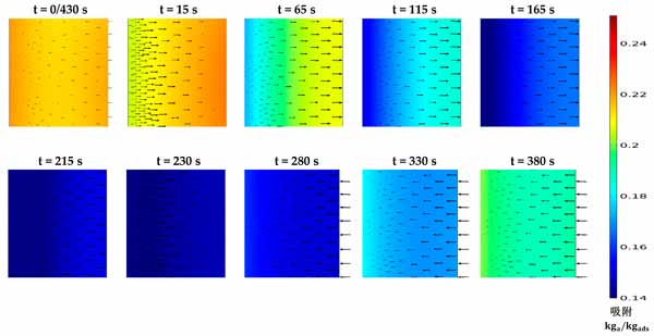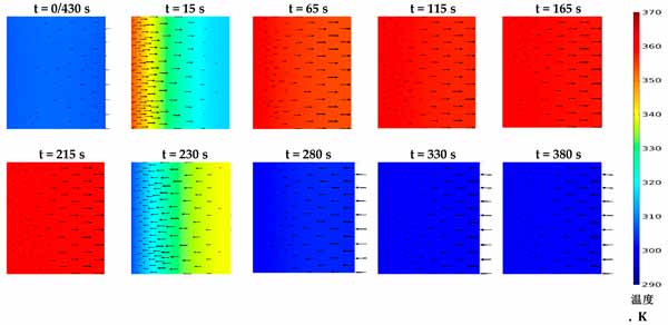 活性炭復合吸附劑的壓力和溫度決定了平衡吸收,它代表了在給定時間分別在吸附和解吸階段可以達到的最大和最小吸收容量。然而,顆粒內和顆粒間的傳質阻力表明吸附材料在每種給定情況下可以多快達到其平衡吸收能力。這突出了在本研究中同時求解兩種傳質機制與其他控制方程的重要性,以顯示促進傳熱對傳質的凈效應。圖2顯示了在430秒循環時間內,考慮到預熱和預冷階段均為30秒的時間間隔內代表性部分的固結吸附劑域的溫度分布。