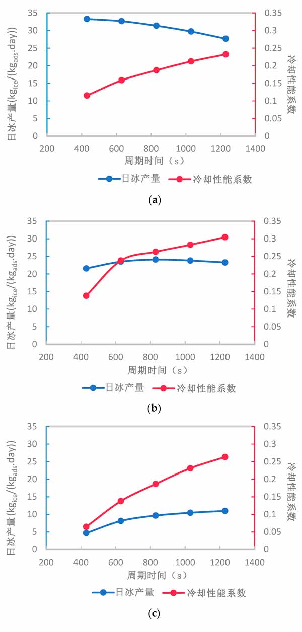 在活性炭厚度為2、5和10mm時,循環時間的變化對制冰系統的每日制冰量和冷卻性能系數的凈影響如圖4所示。總體而言,在給定范圍內增加循環時間可以增加或減少系統的每日制冰量,具體取決于活性炭復合材料的厚度。然而,無論活性炭復合材料的厚度如何,系統的冷卻性能系數通過增加循環時間而增加。盡管如此,系統冷卻性能系數在1230的較長循環時間和5mm活性炭復合材料厚度下達到其最大值。通過增加活性炭復合材料的厚度,日冰產量在不同循環時間內的變化范圍顯著減小,這可以通過比較圖4a-c中給出的每日制冰量范圍看出。這歸因于活性炭復合材料厚度較厚時有效吸收的減少。