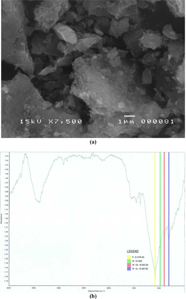 圖1:活性炭負載的磷鎢酸(a)x7500放大倍數的掃描電子顯微鏡圖像和(b)FTIR光譜。
