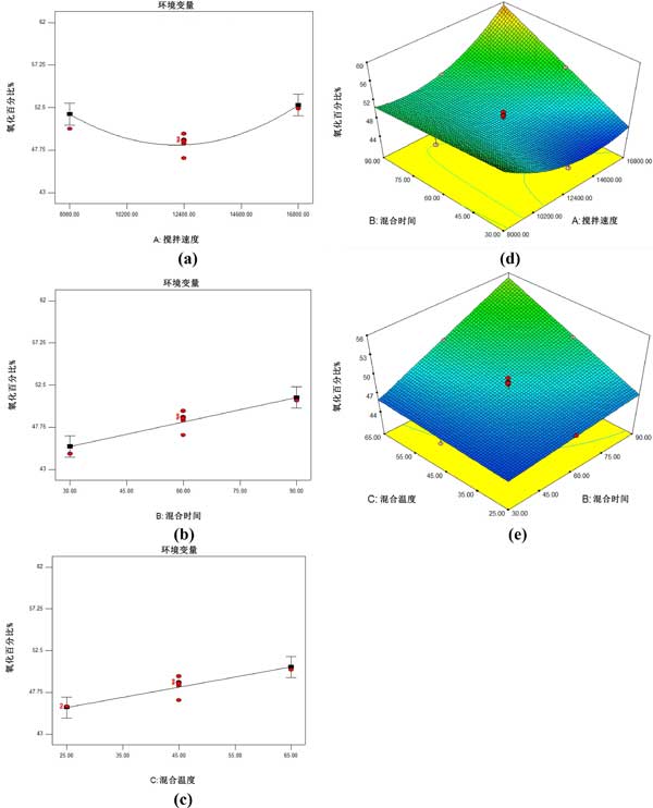 圖2:(a)混合速度、(b)混合時間和(c)混合溫度與活性炭催化氧化百分比相關的模型圖和(d)混合時間和混合速度和(e)相互作用的影響的3D模型圖。