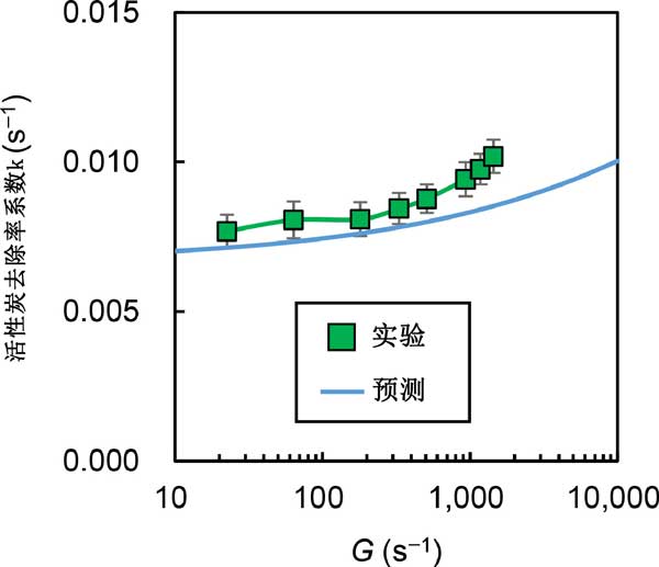 我們研究了混合強度對去除率系數(k)的影響(圖1)。我們繪制了實驗數據,實線顯示了方程式預測的值。實驗結果和預測結果都表明,去除率系數隨著混合強度的增加而增加,但在G>1000s-1的范圍內,實驗結果的增加率變得更陡峭,偏離預測的速率系數值。我們假設偏差背后的急劇增加是由于活性炭顆粒在高混合強度下的分解(在給炭時輕度聚集)。這些預測是在假設活性炭顆粒的尺寸(部分聚集在原料懸浮液中)在給炭后保持不變的情況下做出的,因為原位顆粒尺寸測量是不可能的。如果這個假設是正確的,那么去除率系數隨著混合強度的急劇增加,在高G對于在給炭時已經處于分散狀態的活性炭顆粒,不應觀察到-值范圍。為了驗證這一假設,我們使用了非聚集活性炭,其粒徑在分散處理前后沒有變化,我們在不同的混合強度。我們沒有觀察到隨著活性炭混合強度的增加,去除率系數的急劇增加,強烈表明觀察到的活性炭的急劇增加是由于高混合條件下的顆粒分解。