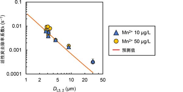 我們將Mn2+去除率系數(k)與活性炭的粒徑進行了比較(圖3)。我們使用源自相同活性炭的九種尺寸的碳顆粒繪制了實驗數據,以便與方程式的預測進行比較。實驗值和預測值幾乎一致,并且在雙對數圖上都顯示出線性關系。仔細觀察發現,預測值的斜率比實驗值更陡,在較大顆粒范圍內,實驗值略大于預測值。這可能是由于顆粒形狀或表面性質的任何差異:我們假設了一系列參數值,包括球形值,這些預測與顆粒大小無關,但在實際的活性炭中,這些值可能隨顆粒大小而變化。總體而言,活性炭的粒徑對Mn2+去除性能有很大影響。