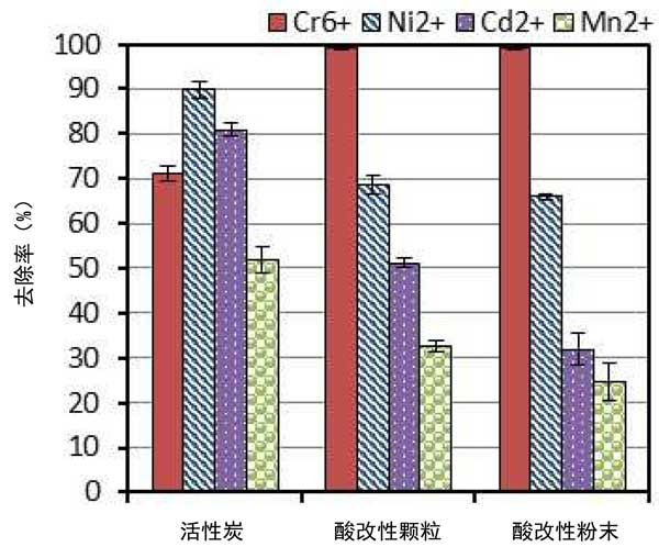 來自采礦活動、工業和城市廢物以及垃圾填埋場滲濾液的重金屬對地下水和地表資源造成嚴重污染。重金屬對水的污染可能來自不同的來源。Cd2+,Cr6+,Mn2+,Ni2+被引入到水資源和環境中的主要來源是廢家用電池和充電電池、電鍍、制革工業、化肥、石化產品和煉油廠廢水。本文研究了使用酸改性和未改性活性炭吸附從含有Ni2+、Mn2+、Cr6+和Cd2+的季銨鹽水溶液中競爭去除金屬離子的方法。活性炭用硝酸氧化,呈顆粒狀和粉末狀,并測試其對金屬離子從水溶液中的競爭吸附。