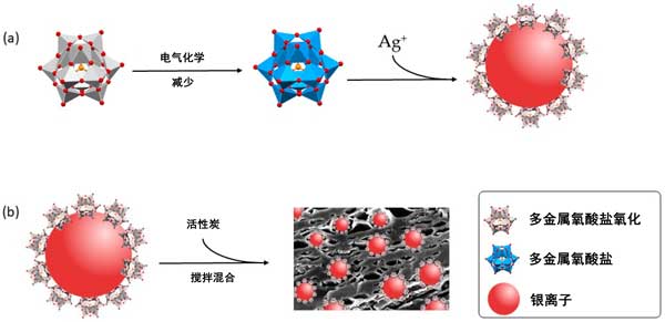 圖1:(a)多金屬氧酸鹽納米銀的合成示意圖,其中多金屬氧酸鹽同時充當還原劑和穩定劑,(b)三組分多金屬氧酸鹽納米銀雜化材料的制備過程。不在規模上,多金屬氧酸鹽的大小為1nm,納米銀的大小約為27-43nm,具體取決于初始試劑濃度。