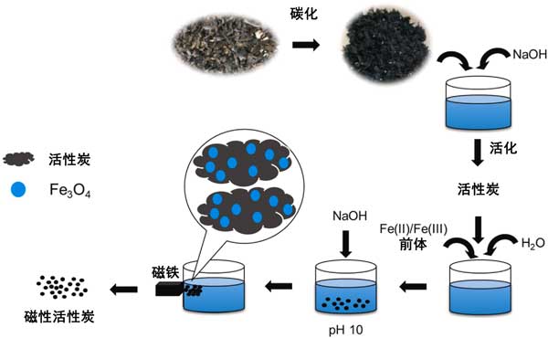 磁性活性炭的合成是通過將活性炭、Fe(II)和Fe(III)前體以w/n/n(1:1:2)的比例混合并添加H2O至體積150mL來進行的。的混合物。然后將溶液在60℃下混合30分鐘。之后,逐漸添加10M/NaOH直至混合物的pH變為10。達到pH10后,將懸浮液混合物攪拌60分鐘并靜置過夜。之后,使用外部磁鐵將形成的活性炭材料從溶液中分離并使用H2O和C2H5OH洗滌。將獲得的固體在50℃溫度的烘箱中干燥。碳化過程的目的是使用爐子在400℃的溫度下持續2.5小時獲取木炭。然后使用NaOH活化木炭并進入下一階段(圖1)。經過處理,205克原料產生了31.6克活性炭。在炭化過程中,發生了幾個變化,在烘烤過程中變黑并比之前稍干,在爐內顏色變黑并干燥。