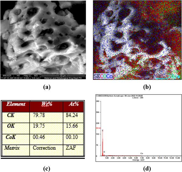 圖3:(a)活性炭的形態結構,(b)元素C、O和Co的分布圖,(c)樣品中元素組成值表,(d)樣品中元素組成值圖。