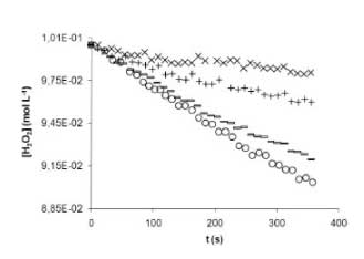 為了獲得關于活性炭的化學性質的更多信息,就其酸性-堿性和氧化還原性質而言,研究了溶液的pH和過氧化氫中活性炭表面的化學修飾的影響。 。對于該反應混合物與過氧化物濃度0.100mol L的固定組合物-1和CAT等于2,00x10 -3克·毫升-1 在298K的溫度下發現:在2-10個pH單位的溶液范圍內,初始反應速率沒有顯著變化。該結果與Bohem滴定法給出的活性炭中官能團的組成一致,其中活性酸基團與堿性基團相比是非常低的比例。強氧化劑,如高錳酸鉀和過氧化氫,會大大改變影響過氧化氫的表面(圖1),從而可以推斷活性炭表面存在還原基團作為過氧化氫的活性位點。活性炭表面的化學處理按以下方式進行:用HNO3濃度5mol L-1 6個小時,用KMnO 4濃度0.08mol L-1在酸H 2 SO 4 濃度為0.5mol L-1 4小時用H 2 ö 2 的30%72小時。在每次處理結束時,將活性炭置于索氏提取器中一周,直到保證恒定的pH值。最后將活性炭在110℃下干燥至不再減輕重量,然后儲存在干燥器中。