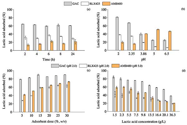 目前的研究表明,活性炭是一種好的吸附劑。然而,吸附在吸附劑上的乳酸的量不能作為選擇合適吸附劑的唯一參數(shù)。另外,活性炭的吸附能力經(jīng)過不同的吸附和解吸循環(huán)后可以降低,因此活性炭的長期性能對選擇最經(jīng)濟可行的材料至關(guān)重要。從吸附劑中解吸乳酸是一個重要的因素,需要作為下游加工策略來考察,但超出了本研究的范圍。