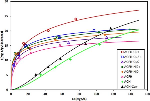 BT,DBT和4,6-DMDBT在浸漬有不同銅或鎳物種的活性炭纖維上的吸附等溫線如圖1,圖2和圖3所示。將實驗吸附數據擬合到LF模型并繪制以顯示這些圖中的整體等溫線趨勢。大部分吸附劑的吸附數據符合LF模型,相關系數大于0.94。與活性炭纖維等溫線不同,兩種介孔活性炭和ACH-Cu +的 DBT等溫線碳含量較低,相關系數分別為0.81和0.86。在低濃度(<50mg S / L)下觀察到的微孔活性炭纖維的較高吸附親和力是由于DBT在高能超微孔中的吸附所致。活性炭纖維等溫線也類似于標準I型等溫線。然而,對于中孔活性炭,觀察到等溫線的線性趨勢,表明在測試濃度范圍內具有相似的吸附親和力。盡管微孔碳在〜200mg S / L的平衡濃度下達到其最大TC容量,但是兩種測試的活性炭在較高濃度(>200mg S / L)下預計具有更高的容量。我們的結果表明,銅或鎳浸漬提高了活性炭的吸附能力。然而,這項研究量化了不同單個金屬物種對噻吩類化合物吸附的重要性。這項工作的一個具體的方法中,對吸附劑(所述金屬浸漬之前)到高溫氫還原除去活性炭的酸性氧官能團。因此,可能作出的貢獻的氧酸性基團可以排除在外。所有活性炭纖維具有相似的微孔性和可比的超微孔性。因此,活性炭對噻吩類化合物的吸附增強主要歸因于特定負載的銅和鎳物質的影響。