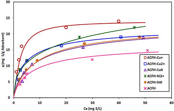 圖1. DBT在浸漬有不同銅和鎳物質的活性炭上的吸附等溫線。