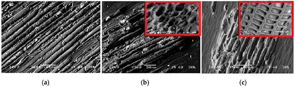 圖中顯示了活性炭和對比材料的SEM背散射電子圖像(BSI)。可以看出,活性炭其表面上具有排列良好的孔隙。然而,由于高分子量揮發物的釋放,鋸末的纖維結構在熱解后被改變,這影響了孔的數量和直徑,觀察到尺寸為9-16μm的較小的孔和尺寸為21-48μm的較大的孔。這也表明,形成了幾個良好的方向微孔與尖銳和彎曲的邊緣形成。孔隙率增加,由于脂族C結構與芳族C結構變換。