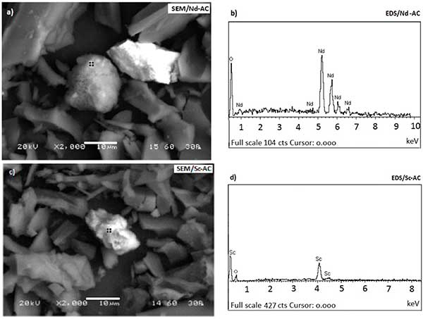 圖2、2000×時的SEM顯微照片和分別在Nd(a,b)和Sc(c,d)吸附后的活性炭的相應EDS光譜。