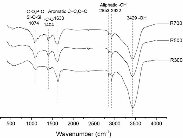 圖1.來自原料熱解的活性炭的變換紅外(FTIR)光譜分析。