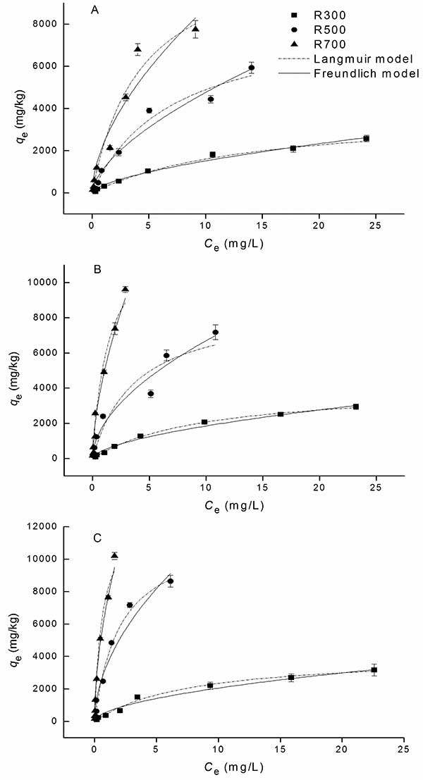 活性炭樣品上四環素的吸附等溫線如圖1所示。吸附數據顯示與Langmuir和Freundlich模型都很好,R 2系數高于0.919 。對于Freundlich模型中的參數,不同樣品的n值相近(0.53-0.62),小于1,說明吸附是濃度依賴性過程。反映樣品吸收四環素能力的K f的值在700℃熱解產生的活性炭中最高。q max表示的趨勢Langmuir模型中的值也表明吸附容量隨著熱解溫度的增加而增加。計算最大吸附容量在大約11,834-14,157mg / kg的范圍內。表面積是已知的是影響活性炭的吸附能力的一個重要因素,尤其在去除四環素的情況下。這在本研究中得到證實,活性炭樣品的表面積(S BET)與q e值顯著正相關。在較高的熱解溫度下,活性炭樣品的表面積增加,吸附能力增加。