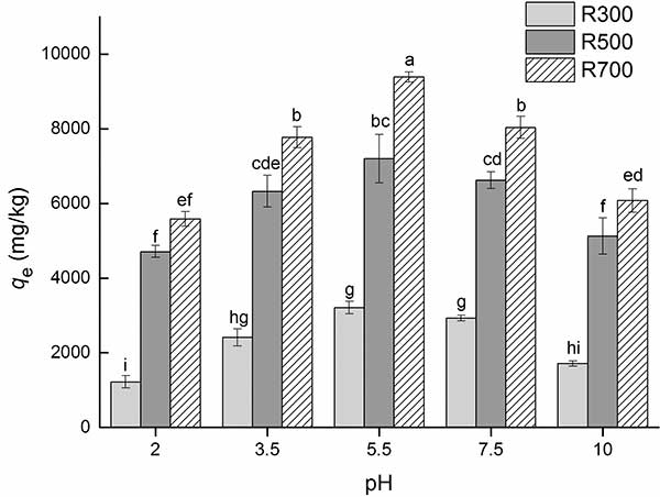 圖3. pH對活性炭吸附四氯化碳的吸附能力的影響。四環素溶液濃度為32mg / L。數值是三重均值±SD。字母表示處理之間在p <0.05水平上的顯著差異。