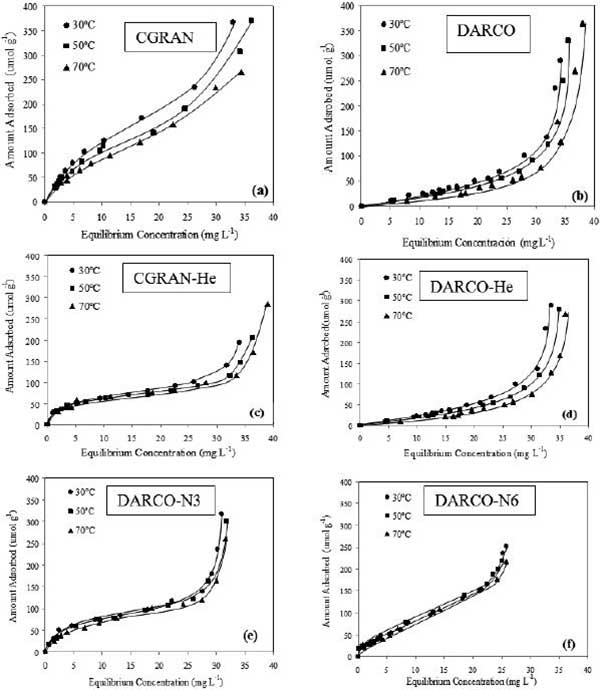 評估原樣處理的活性炭對松香酸的吸附情況,結果如圖1所示。該圖描繪了在處理前和后處理的CGRAN和DARCO活性炭的三種溫度(30,50和70℃)下作為平衡濃度函數的吸附容量。從先前對吸附速率的研究(此處未顯示),確定在30分鐘達到吸附平衡。根據分類等溫線,CGRAN和CGRAN-He(圖1a和1c)顯示了“L”型等溫線,這是樅酸和吸附位點之間強親和力的特征。DARCO(圖1b)和DARCO-He(圖1d)活性炭表現出“S”型等溫線,歸因于溶質和溶劑之間競爭吸附的結果,松香酸對吸附位點的親和力較低。圖1e和1f所示的HNO3氧化樣品(DARCO-N3和DARCO-N6)的 等溫線為“L”型吸附等溫線,樅酸和溶劑之間具有強親和力的特征。26,27另外,DARCO-N3展示了一個被歸類為“L2”的等溫線,其中平臺指示表面上的所有可用位點均分布在單層中,并且DARCO-N6根據“L1”子群顯示等溫線,其中沒有觀察到高原,表明未覆蓋單層。 這種行為與DARCO-N6顯示的更多的表面功能組一致。
