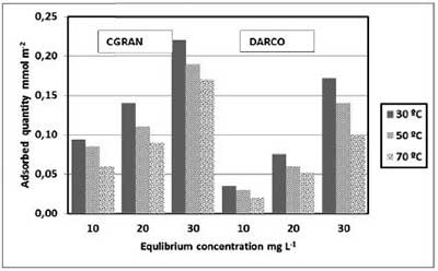 為了確定表面氧基團的具體影響,通過S BET將吸附容量標準化。如圖2所示,CGRAN活性炭具有比DARCO活性炭更高的松香酸吸附容量。在測試的三個溫度下觀察到CGRAN的更大的吸附容量。根據平衡濃度CGRAN的平均吸附能力高2-3倍。然而,由于更大的吸附潛力,這種差異在較高的平衡濃度值下降。表面積歸一化吸附量表明,氧官能團的存在對活性炭的吸附能力起著重要的作用。CGRAN的較高的吸附能力可通過的強酸位的存在來解釋(作為較高量的官能團的結果),有利于松香酸的吸附高達30毫克的L -1。對于DARCO活性炭來說,情況正好相反。