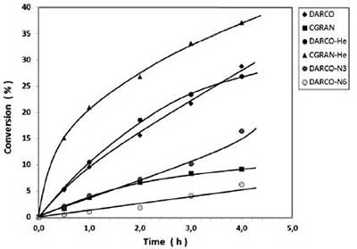 作為催化劑,使用兩種活性炭,簡稱分別為CGRAN和DARCO。為了改變其化學表面,考慮了兩種改性處理方法。