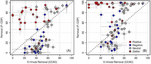 圖2.比較在(A)等效質量基礎和(B)等效表面積基礎上進行的批量實驗測量的每種微污染物與P-CDP或活性炭接觸5分鐘后的百分比去除率。每個面板中的誤差線代表五次測量的標準偏差。顏色表示在進行實驗的pH(pH = 7)下微污染物的電荷狀態。
