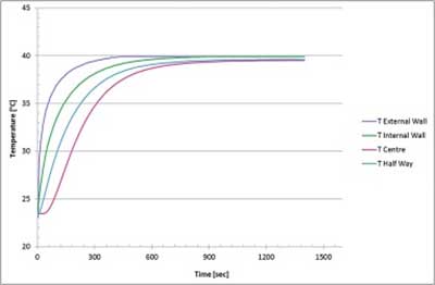 圖2、 當設備從環境條件轉移到40℃的水中時,床中和設備外表面上的溫度分布。