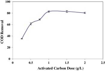 氧化處理后產(chǎn)生的污水仍然含有相當數(shù)量的有機物,如COD殘留值(470 mg / L)。因此,采用后處理方法,通過使用活性炭,從處理后的廢水流出物中除去殘留的有機物質(zhì)。活性炭從處理過的流出物中吸附有機化合物可能是由于溶質(zhì)的疏水性。