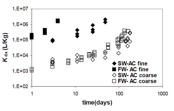 圖2:活性炭樣品吸附菲的時間。兩個不同的粒子直徑記錄(活性炭:2毫米,活性炭:0.25-0.06毫米)。