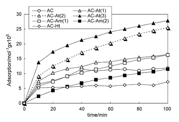 實驗條件:在N2中使用210ppm的甲硫醇作為甲硫醇氣體。活性炭的制備,活性炭通過碳化隨后活化制備。用蒸汽進行活化。用HNO3/H2SO4溶液進行活性炭的酸處理。將1克活性炭在100立方厘米HNO3/H2SO4溶液中在室溫下攪拌0.5小時。過濾分離經過處理的活性炭,并在超聲條件下用去離子水洗滌數次,直到水的pH值達到5以上。然后將活性炭在100℃空氣中干燥12小時,在150℃下真空干燥1小時。用HNO3,HNO3/H2SO4(1/1比例)和HNO3/H2SO4(1/3比率)處理的活性炭分別表示為AC-At(1.2.3)。胺化合物對活性炭的改性通過十六胺的吸附來進行。將活性炭浸入十六烷胺/乙醇溶液中并在室溫下攪拌30分鐘。然后過濾分離活性炭并在室溫下真空干燥2小時。由4×10-6和3.3×10-5摩爾m-3十六胺溶液制備的活性炭分別表示為AC-Am(1.2)。活性炭(AC-Ht)的熱處理在Ar氣氛中在600℃下進行2小時。