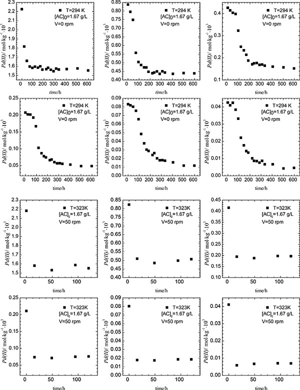 圖1:氯化鈀復(fù)合離子初始濃度的初始濃度對活性炭吸附影響。實(shí)驗(yàn)條件:pH1,Cl-=0.1mol·kg-1。