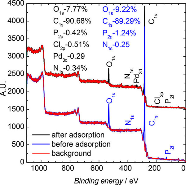 吸附過程之前和之后材料的完整XPS光譜如圖2所示。考慮到觀察到的溶液中Pd(II)濃度的降低,估計(jì)鈀負(fù)載等于0.7%(m/m)。可以看出來自鈀的峰出現(xiàn)。對這個峰值進(jìn)行更深入的分析可以為我們提供有關(guān)鈀電子結(jié)構(gòu)的信息。