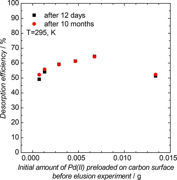 在活性炭表面存在二氯化鈀的情況下,應(yīng)該可以根據(jù)方程解吸它。因此,解吸試驗(yàn)在室溫(20℃)進(jìn)行,使用100厘米3鹽酸(濃度為1mol·kg-1)或100厘米3的高氯酸鹽酸(濃度1mol.kg-1)。必須提及的是,吸附實(shí)驗(yàn)在pH等于1下進(jìn)行,而汽提過程在pH等于0下進(jìn)行。由鈀(II)負(fù)載的活性炭樣品取自先前的吸附實(shí)驗(yàn)。通過過濾將預(yù)加載的活性炭與溶液分離,然后在60℃下干燥。接著,將干燥的預(yù)加載的活性炭與鹽酸溶液混合。解吸試驗(yàn)進(jìn)行約10個月。在前2天,觀察到溶液中鈀(II)濃度的快速增加,最終在12天后獲得恒定值。這些結(jié)果如圖4所示作為黑色方塊。為了確保這確實(shí)是最終的平衡,樣品在接下來的10個月內(nèi)留在溶液中。在此時間之后獲得的值顯示為紅點(diǎn)。過量的鹽酸是顯著的,它應(yīng)該足以溶解二氯化鈀。結(jié)果表明,平衡狀態(tài)不受時間影響,表明觀察到的狀態(tài)是最終狀態(tài)。似乎在該實(shí)驗(yàn)期間,只有約50-65%的鈀(II)物質(zhì)可以從活性炭表面洗脫。如上所述,施加過量的鹽酸。因此,一方面,不完全洗脫可以通過Pd2 OCl2的形成來解釋或活性炭表面上的另一種鈀(II)化合物。另一方面,它可能僅僅與出現(xiàn)與初始狀態(tài)不同的新平衡狀態(tài)有關(guān)。為了切斷推測,進(jìn)行簡單的第二次解吸試驗(yàn),其中使用來自第一次解吸試驗(yàn)的活性炭。實(shí)驗(yàn)條件和程序與第一次解吸試驗(yàn)期間的相同。觀察到鈀(II)的洗脫再次發(fā)生。在最初的24小時后,高達(dá)17%的剩余鈀(II)被解吸,而在2個月后,總解吸效率達(dá)到98.4%的水平。
