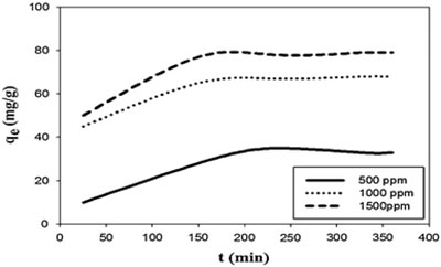 圖3:不同初始濃度對活性炭吸硫能力的影響(吸附劑用量:20 mg / L,溫度:25°C,攪拌時間:360 min)。