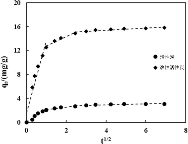 磺胺二甲嘧啶在活性炭和改性活性炭上的吸附和擴(kuò)散過(guò)程可分三個(gè)階段描述,如圖2所示。由于在第一階段吸附在活性炭表面上,吸附速率最初很高。然后,發(fā)生快速的顆粒內(nèi)擴(kuò)散過(guò)程,其中磺胺二甲嘧啶逐漸吸附在活性炭上,并且吸附速率常數(shù)逐漸降低。在第三階段,邊界層和傳質(zhì)阻力的影響增加,導(dǎo)致顆粒內(nèi)擴(kuò)散減慢。所有三個(gè)階段的擬合方程都沒(méi)有通過(guò)坐標(biāo)的原點(diǎn),這表明顆粒內(nèi)擴(kuò)散不是控制吸附速率的唯一步驟。因此,吸附過(guò)程也受膜擴(kuò)散和表面吸附的影響。