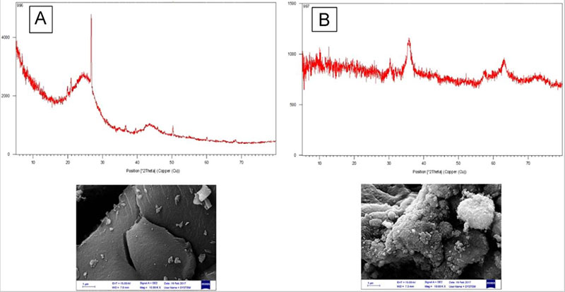 圖1:經(jīng)處理的活性炭(A)和氧化鐵活性炭納米復合材料(B)的XRD圖和SEM圖像。